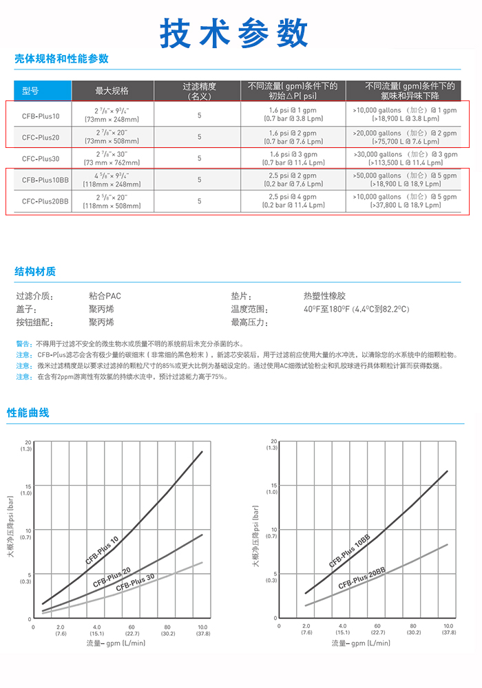 CFB-PLUS系列升级款活性炭滤芯在CFB系列的加强升级款,提供了更高的总净水量。